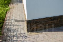 Отмостка : тротуарная плитка по бетонному основанию на пенополистироле.