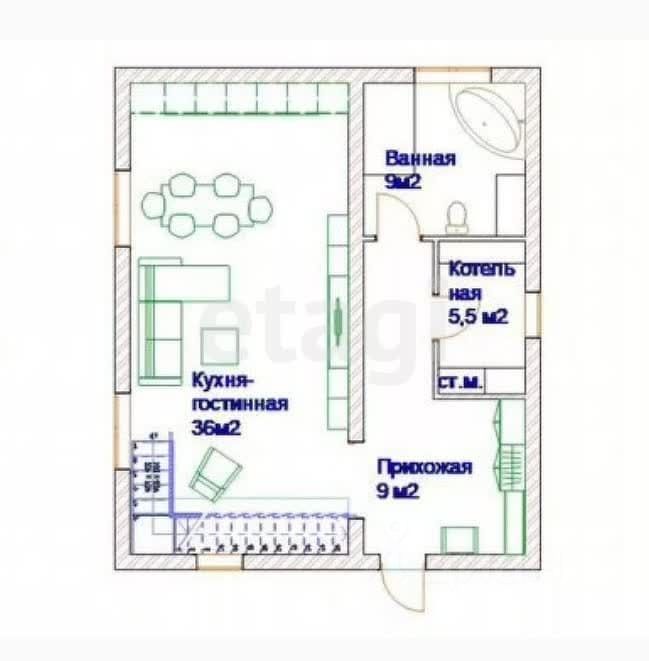 На первом этаже запланирована большая кухня-гостиная 36 м2 с лестницей на 2-ой этаж. Большая прихожая 9 м2. Ванная комната 9 м2 с возможностью устроить ванную зону возле большого окна. В доме отдельно предусмотрена комната для общедомового оборудования 5,5 м2 (газового котла, фильтров для воды, водонагревательной системы, а также расположить постирочную и сушильную зоны).