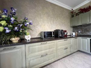 На 1-м этаже дома большая кухня гостиная, стильная кухня благородного темно-оливкового оттенка с качественной встроенной техникой, с обеденной группой и выходом на террасу. Спальня, холл, 1 санузел, котельная.