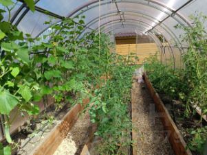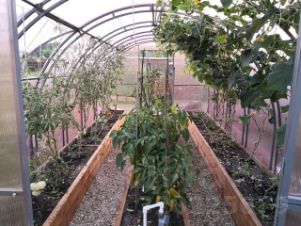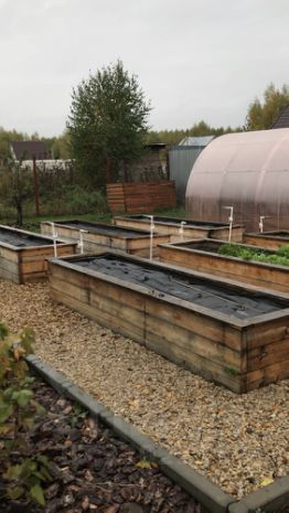 Современная теплица, капельный полив и высокие грядки с индивидуальным поливом, на площадке из трехслойной основе (агроспан, песок, гравий);