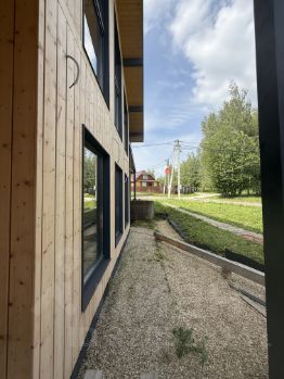 Основной дом общей площадью 237,3 м², крытой парковкой на два машиноместа. Каркасный, изготовлен из качественной сухой древесины, покрыт антисептирующими и огнезащитными средствами.