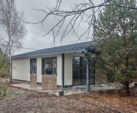 Планировка коттеджа предусматривает три спальни, два санузла (один с ванной), гардеробная, топочная и большая кухня-столовая с гостиной и террасой 60 м2: