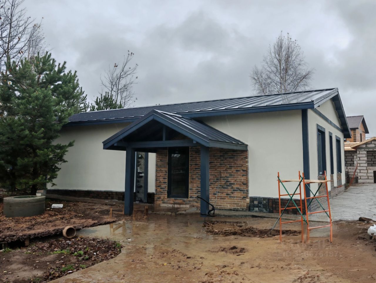 Сделана предварительная ландшафтная планировка участка, залита монолитная въездная плита для парковки. Участок угловой, всего два соседа, рядом КПП и магазин. Соседи живут постоянно.
