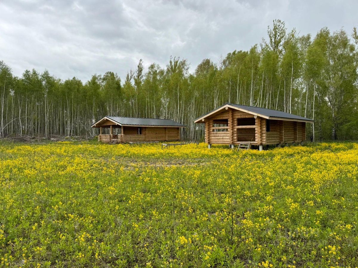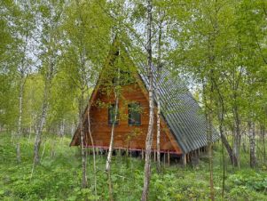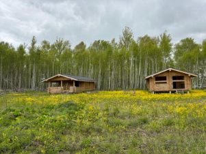 Имеются строения : 2 бани из бревна и 4 А-фрейма.