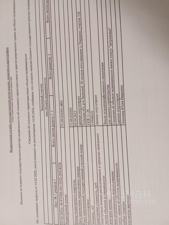 Продаётся участок по адресу Тульская область Заокский район 50 метров Юго западное, деревня Паршино, участок 136 а.