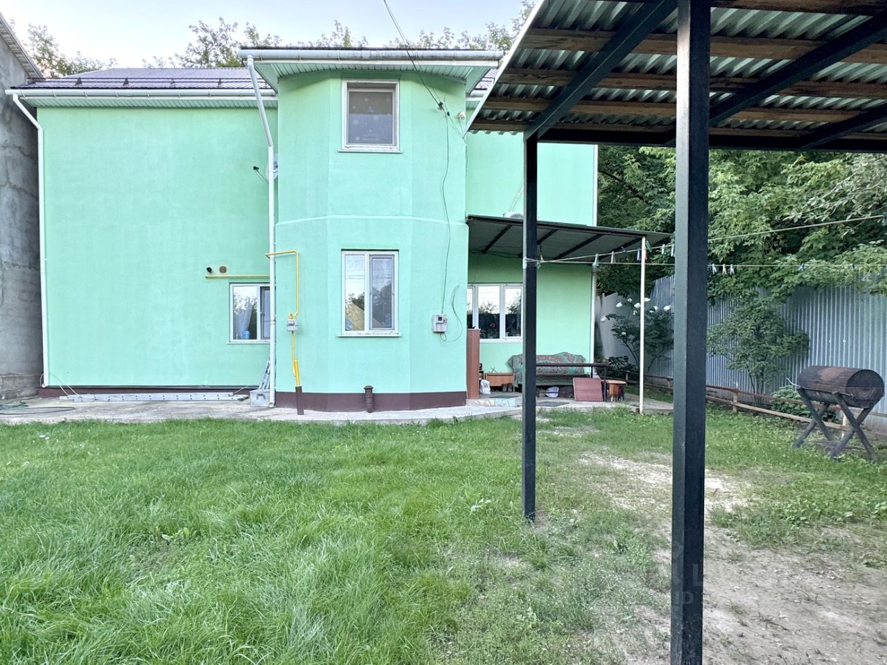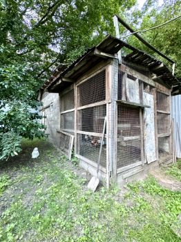 На улице место для посиделок с чаем. Крытый огромный навес для машин. Есть теплица и птичник.
