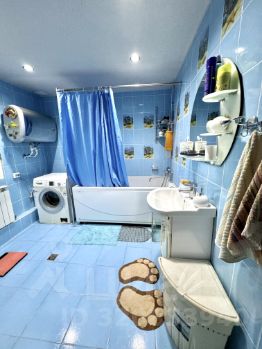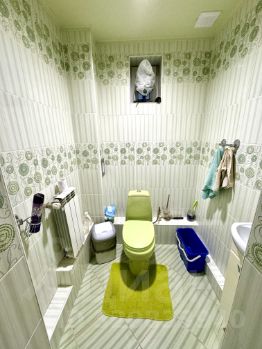 Огромная шикарная ванна в голубых тонах. Отдельно есть санузел в салатовых тонах и кладовка.