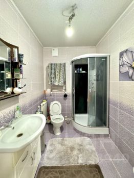 На 2 этаже огромный холл, как комната, и плюс еще 3 комнаты и совмещенный санузел в сиреневых тонах.