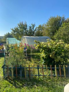 По периметру участка распологаются различные растения: ёлки, пихты, цветы, яблони, слива, кусты смородины красной и черной, малины. По дому растет виноград.