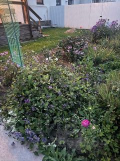 На территории растут плодовые деревья и кустарники: 3 яблони, 2 груши, 10 кустов смородины, 2 вишни, алыча, малина и ежевика. Созданы несколько красивейших цветников.