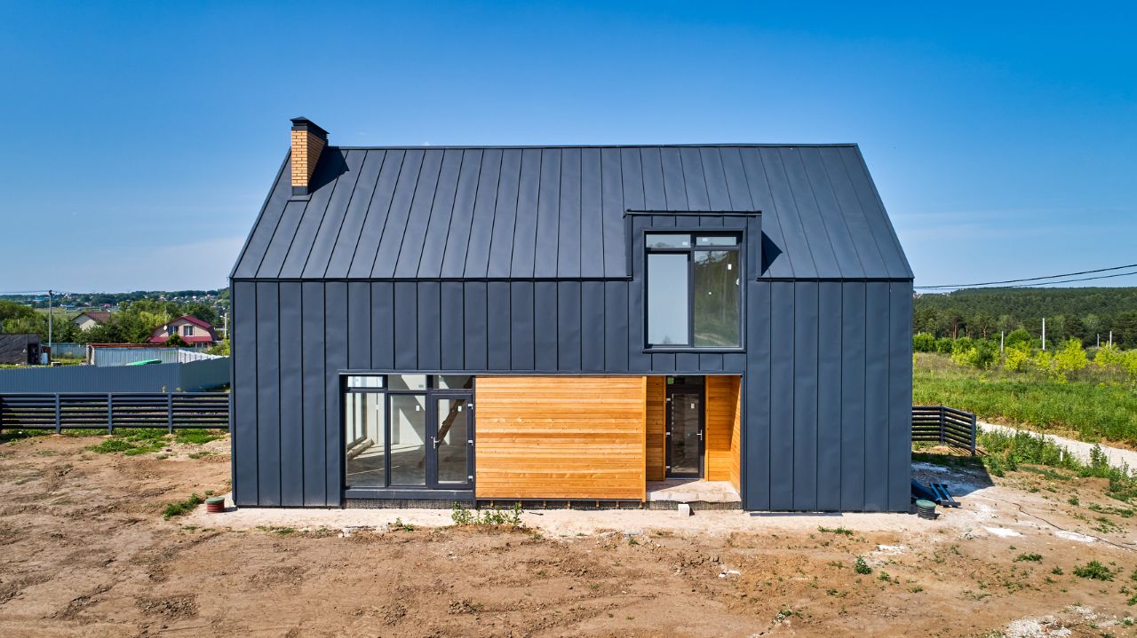 - двускатная кровля, переходящая в вертикальные стены и укрытая эффектным и долговечным фальцем