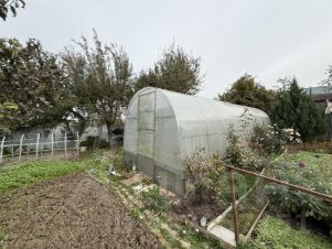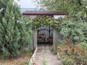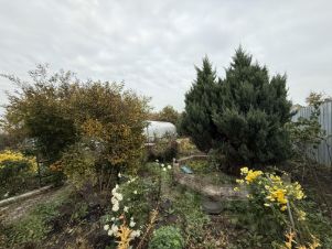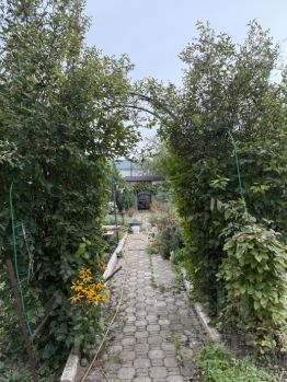 На территории вымощенные плиткой дорожки, две теплицы, крытая просторная беседка. Плодовые деревья, клумбы.