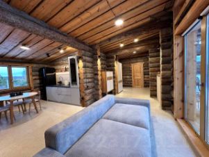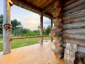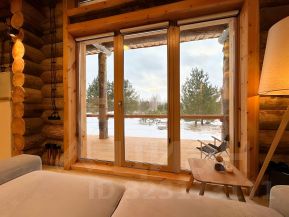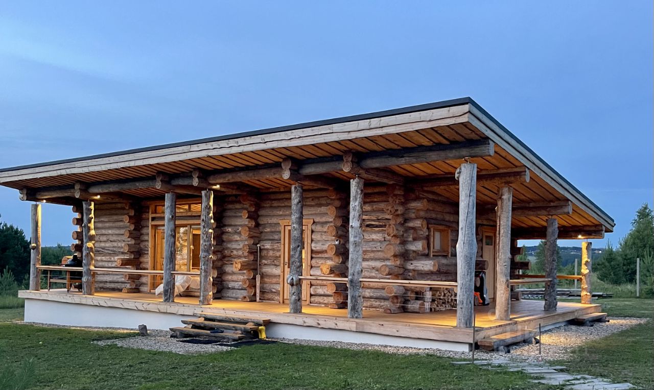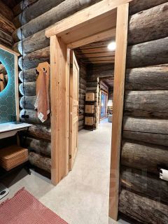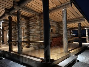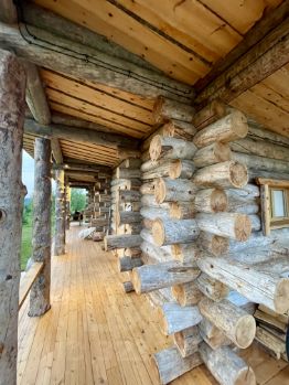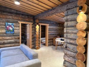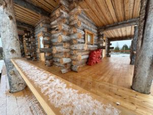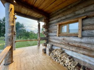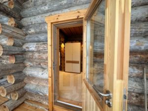 Сруб изготовлен на севере Карелии из кело, так называют сосны выросшие за полярным кругом, высохшие на корню и продолжающие стоять вертикально много лет. В этом диаметре бревна примерный возраст каждого 100+ лет. Штучная древесина реально с уникальными свойствами, её добывают только в северной части Карелии, но ценность не только в том, что это редкий материал, а скорее, что его ничем не нужно обрабатывать, никаких антисептиков и прочих обработок. Древесина плотная, снаружи серебристо серого цвета, а внутри янтарная.