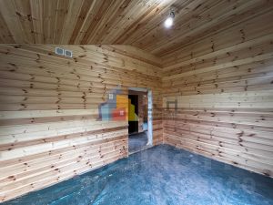Высокие потолки, стены и потолки отделаны имитацией бруса
