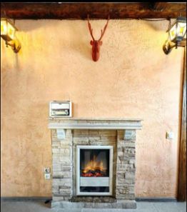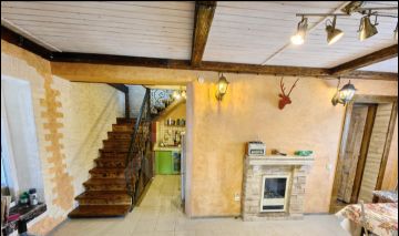 На первом этаже терраса, далее комната с кухонным зоной и камином Также в доме сауна, сан.узел, душевая.Есть большая гостинная с панорамными окнами и собственным выходом на участок. На втором этаже находится две спальные комнаты.