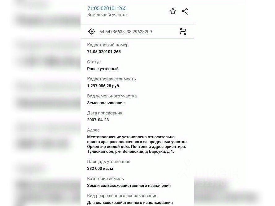 Адрес ориентира: Тульская обл. , р-он Веневский, д. Барсуки, д. 1, участок находится в 800 м. по направлению на Восток от ориентира. Кадастровый номер: 71: 05: 020101: 265. Категория земель: Земли сельскохозяйственного назначения. ВРИ: Для сельскохозяйственного использования.