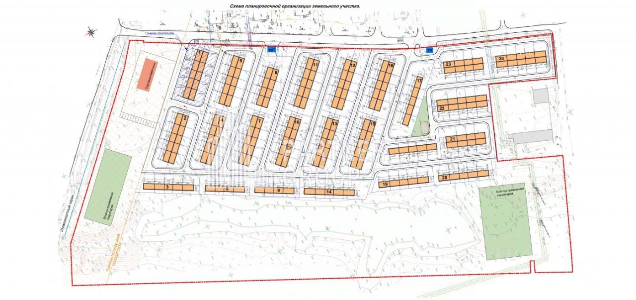 На земельном участке возможно строительство жилого комплекса, состоящего из среднеэтажных домов и/или блокированных домов.