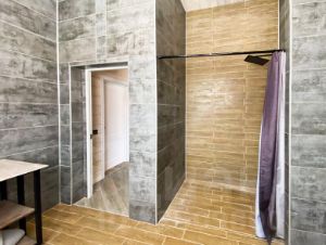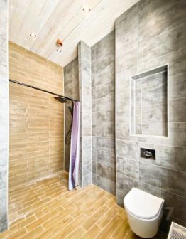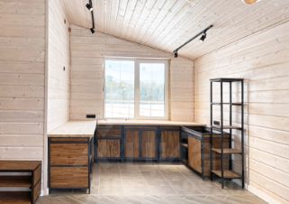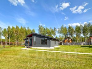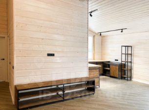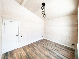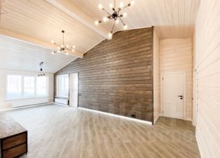 Фундамент: железобетонный плита с утеплением. Стены и кровля: мощный деревянный каркас (доска строганная калиброванная) с утеплением 200 мм, кровля 300 мм; Внутренняя и внешняя отделка стен: шпунтованная доска (3 см) с декоративным защитным покрытием; ванная комната: керамогранит. Покрытие пола: ламинат 33 класс и керамогранит (гостиная, прихожая, кухня, котельная, ванная комната), на веранде и вход в дом: уличный керамогранит.