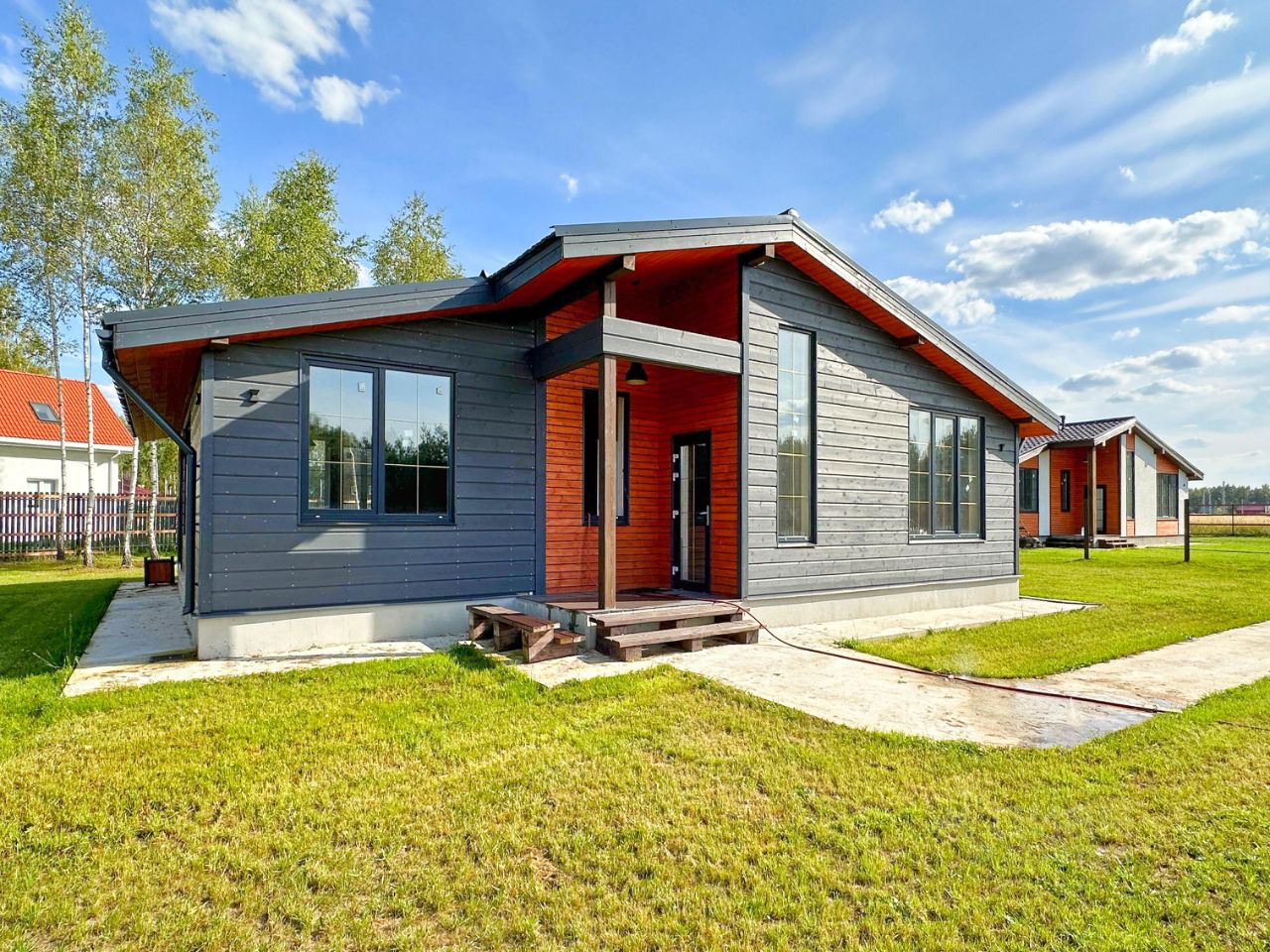 Участок ровный, солнечный, небольшая берёзовая роща, деревянный забор. Бетонные дорожки от ворот до дома и вокруг дома, парковочное место - бетонированная площадка. На участке дренажная система и дождевая канализация. Соседи построились. Круглогодичный подъезд.