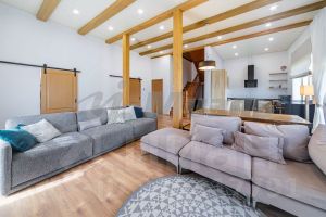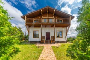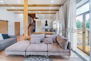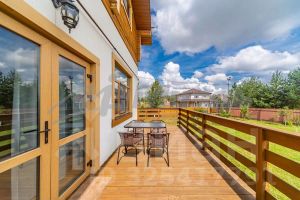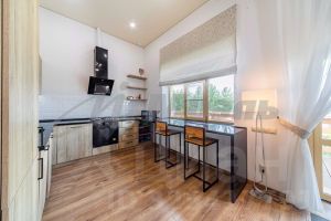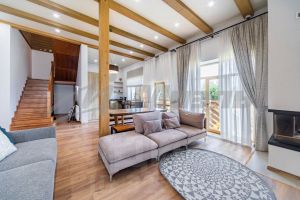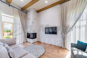 Дом оборудован современной мебелью и бытовой техникой. В гостиной большие панорамные окна, действующий камин. Очень уютно и светло.