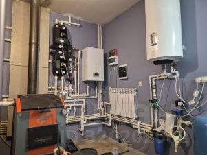 Отопление: электрокотел 14кВт., твердотопливное и газ при подключении.