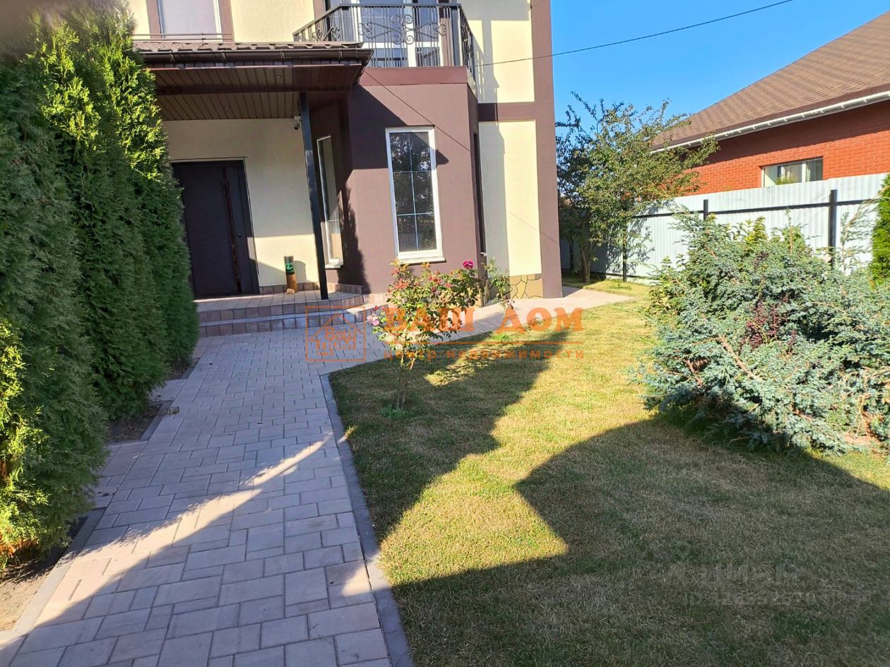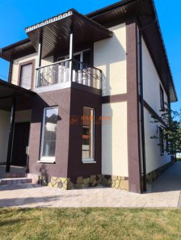 Дом построен в 2019 году из кирпича, под чистовую отделку. Площадь 256 КВ м, планировка включает просторные помещения. На первом этаже расположены прихожая, кухня-гостиная с колоннами, санузел и дополнительные комнаты. На втором этаже — две спальни, каждая с гардеробной и санузлом. Из одной спальни выходит балкон с кованым ограждением.