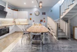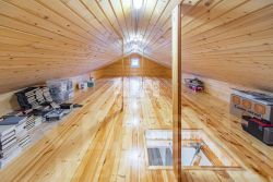 Первый этаж занимает великолепная кухня - гостиная, спальня и санузел с душевой кабиной. 20-ти метровая теплая веранда с панорамным остеклением оборудована выходом на террасу и к мангальной зоне.