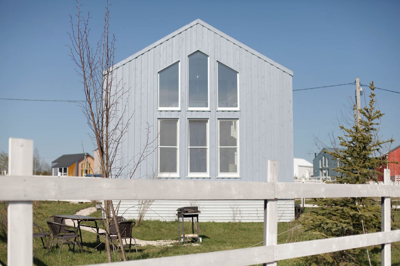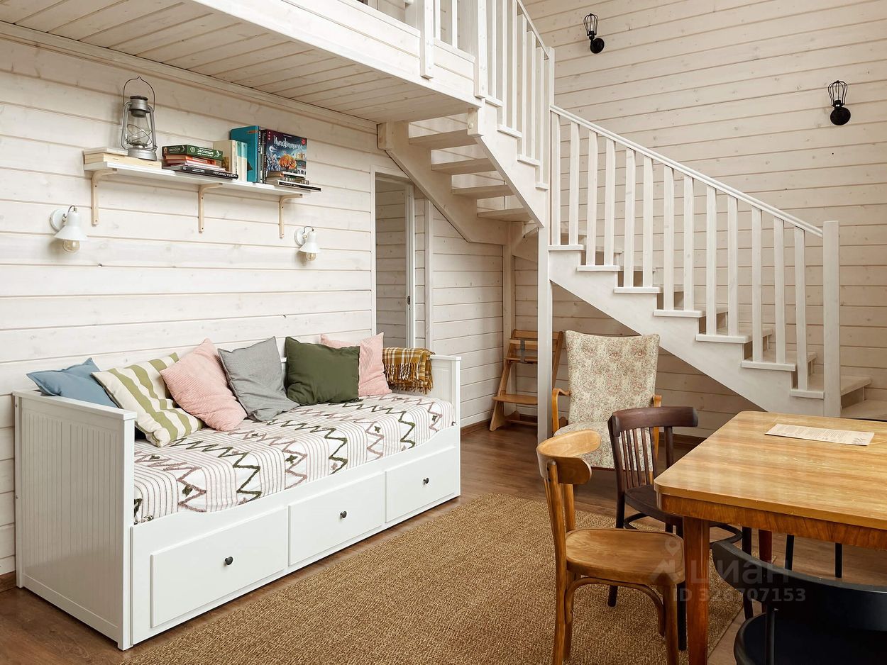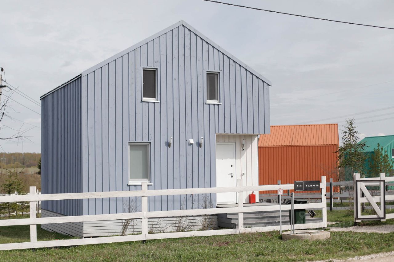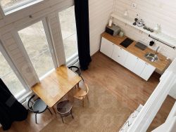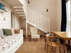 проект: Трио+ (67 м2). Панорамные окна, второй свет в гостиной, удобная лестница и отдельная спальня на втором этаже. На первом этаже отдельная комната. В гостиной оборудована кухня со всем необходимым.