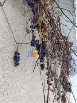 На участке: молодые плодоносящие яблони, кусты смородины и малины, яркие цветы, виноград "Изабелла" (под ним комфортно устраивать летние застолья).
