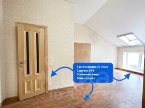 На третьем (мансардном) этаже располагается большая комната, поделенная на несколько зон и санузел в кафеле.