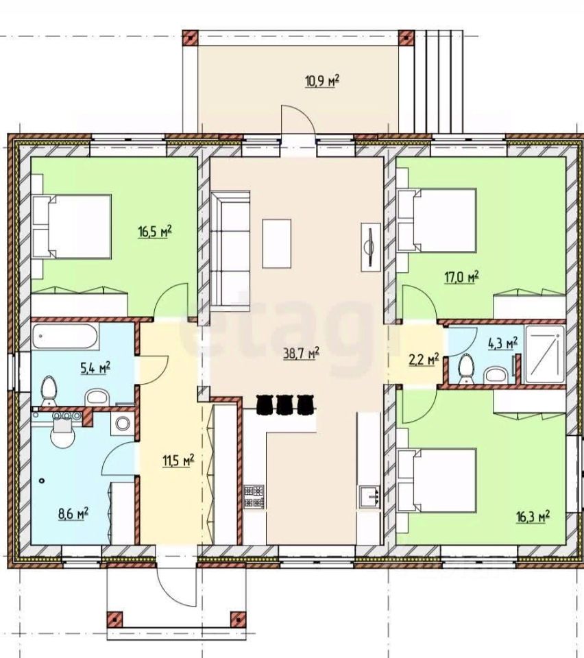 Планировка продумана для комфортного проживания: просторные спальни 16,5, 17 и 126,3 кв. м, а также объединенная кухня-гостиная 38,7 кв. м с панорамными окнами и выходом на террасу.