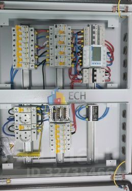 - Электричество 15 кВт заведено в дом в распределительный щит. Щит собран с использованием автоматов, реле напряжения, и УЗО по проекту. Возможность управления через Wi-Fi удаленно.
