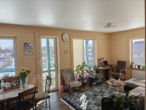 Дом одноэтажный, 4 комнаты: кухня-гостиная, 2 спальные комнаты, техническая комната, 2 санузла, предбанник, большая терраса/зона патио. В доме качественная отделка, натяжные потолки, ламинат, влагостойкий кварцвениловый ламинат. Отделан доской имитация бруса и покрашен.