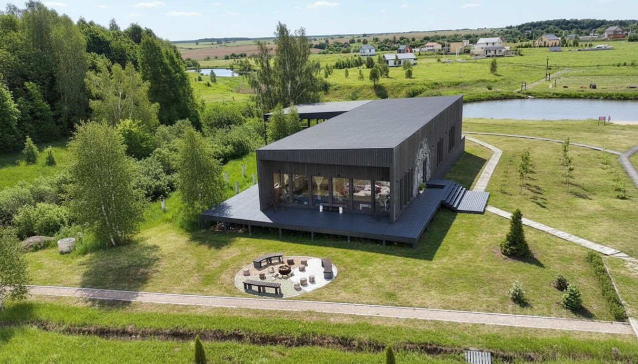 Здание расположено в коттеджном поселке "Ванберри" - это экопоселок для семей, молодых пар, родителей с детьми. В поселке сложилась традиция экологичного образа жизни, без алкоголя и табака на общественных территориях.