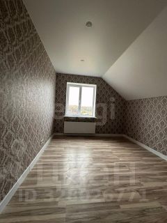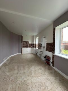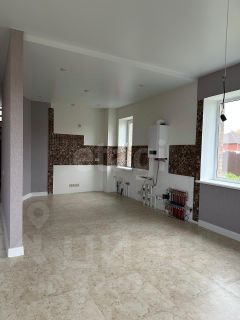 Tёплыe полы на первом этаже (плитка в кухне-гостиной и санузлах), ламинат в комнатах и на втором этаже, натяжные потолки с встроенными светильниками, на стенах - обои.