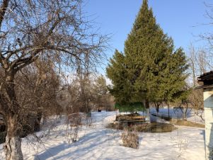 Окружение: На территории уже есть взрослые деревья (включая великолепную высокую ель), которые создают уют и приватность.