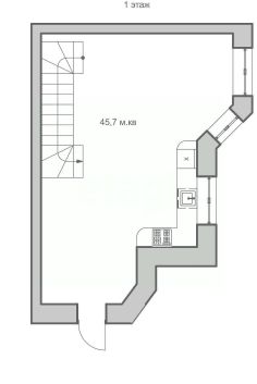 На первом этаже дома размещена прихожая с местом для хранения вещей, просторная кухня-гостиная и раздельный санузел.