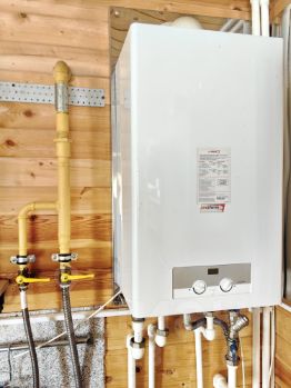 Из коммуникаций, электричество 15кВт, заведён Газ, для отопления дома установлен двухконтурный котел по дому разведены радиаторы, в том числе на втором этаже, также от котла идет горячая вода, сама вода заведена из собственного колодца, канализация выведена в септик, подключен интернет.