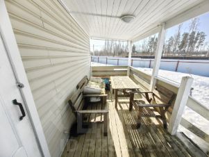 Построен по каркасной технологии на свайном фундаменте, снаружи обшит сайдингом внутри вагонка пропитанная лаком, оставлен естественный цвет дерева.