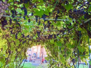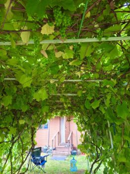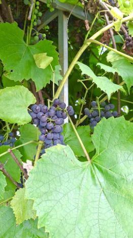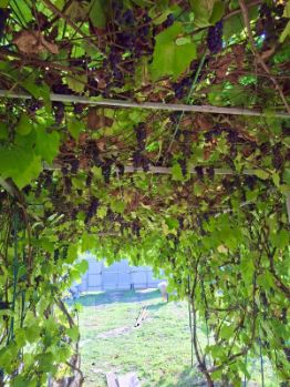 кусты : виноград , смородина, крыжовник.