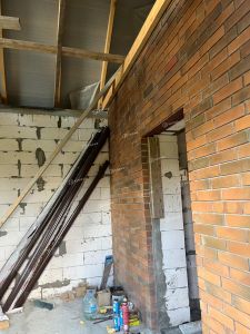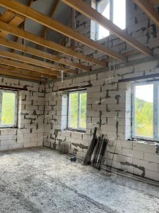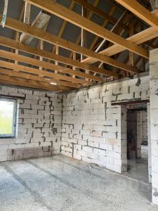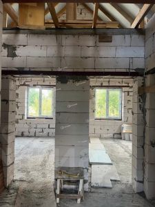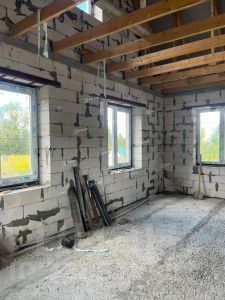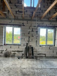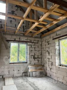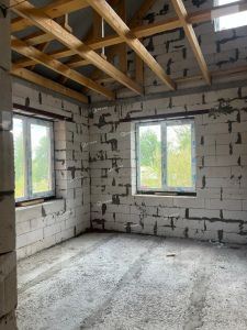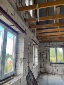 Фундамент дома выполнен из свай, что обеспечивает надежность и стабильность всей конструкции. Стены изготовлены из газобетона и кирпича, что придает дому хорошую теплоизоляцию и звукоизоляцию.