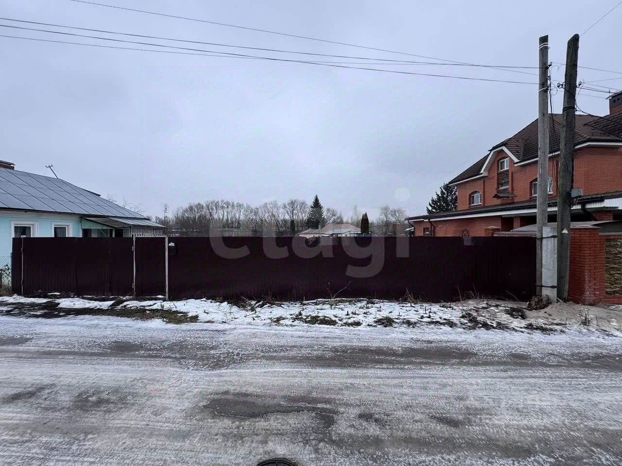 Участок огорожен забором с двух сторон. По границе участка коммуникации: газ и канализация. Электрический столб стоит на границе участка. Вода центральная.