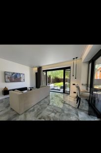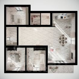 • Детали: Панорамное остекление, пол из керамогранита под мрамор, стильный санузел с душевой кабиной.