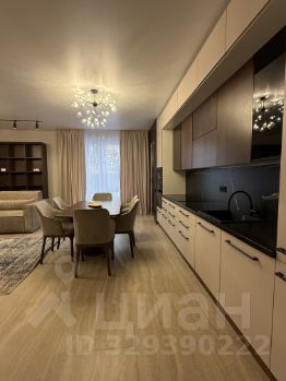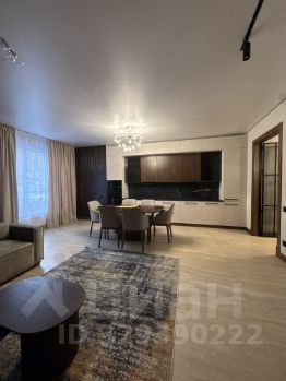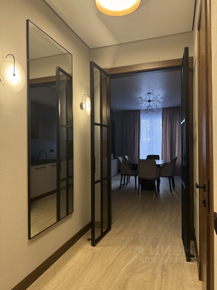 Внутри — дизайнерская отделка: сочетание дерева, камня и стекла, нейтральные природные оттенки и акцентные детали. Просторная гостиная переходит в столовую и кухню, оборудованную современной техникой и мебелью.
