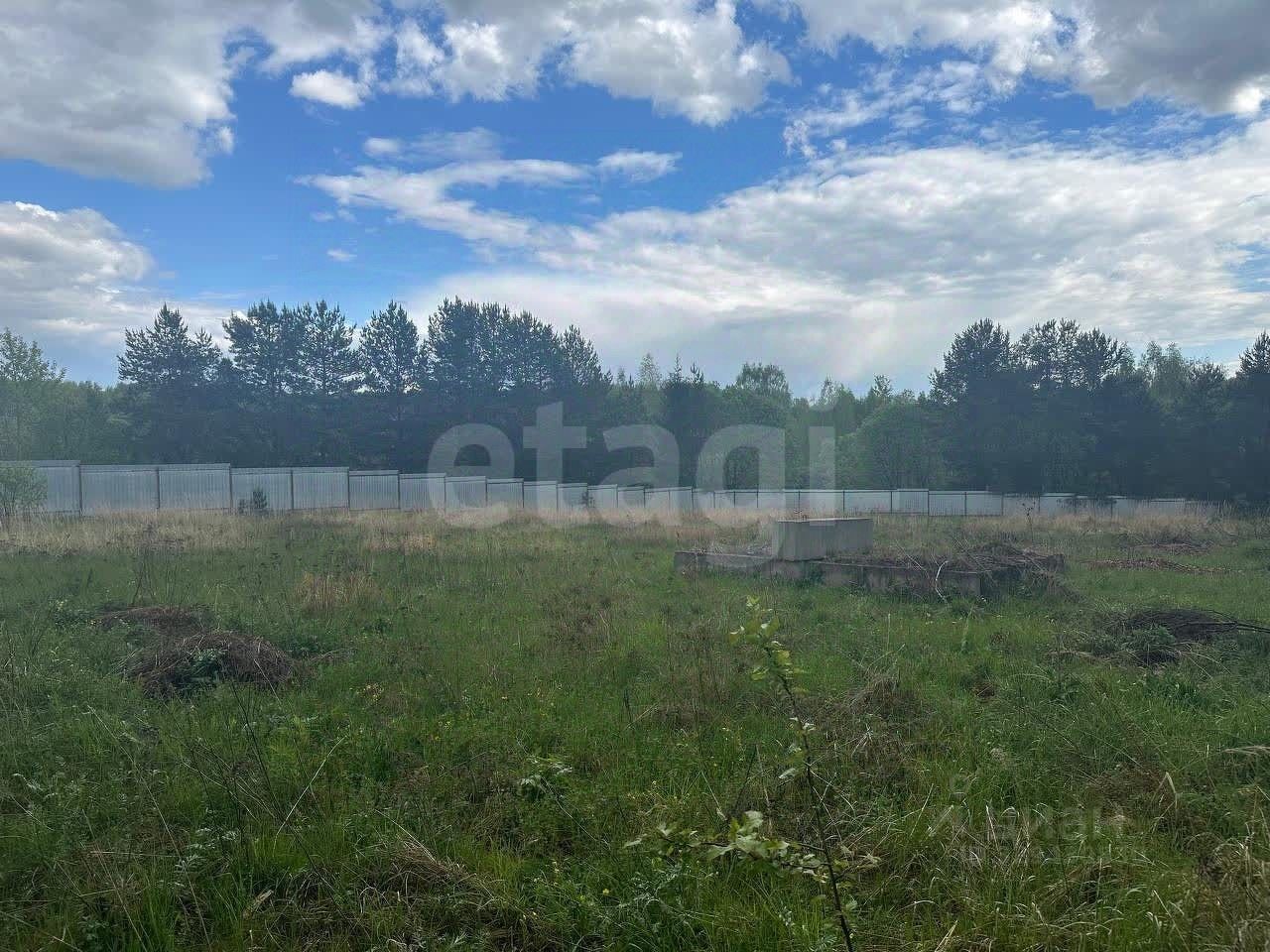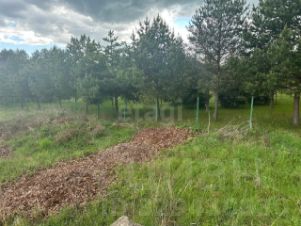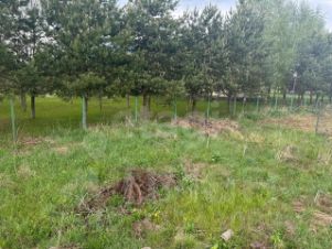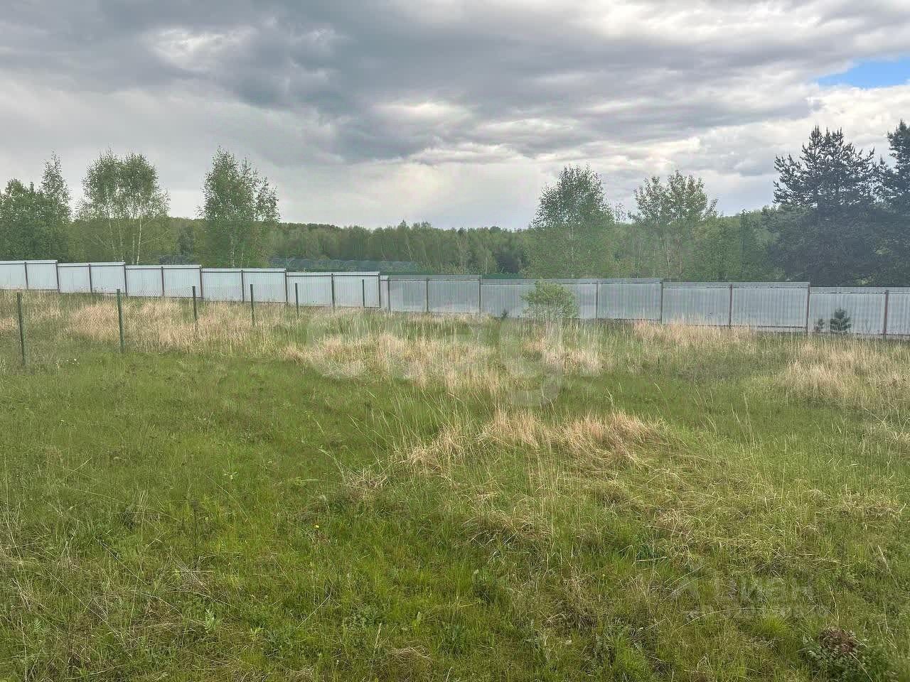 Весь участок обнесён забором (внешняя сторона из профлиста, граница с соседями сеткой-рабицей) ,по бокам уже живут соседи, по периметру растут сосны.