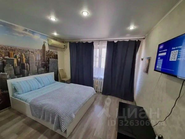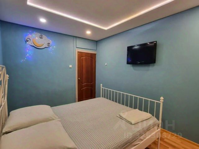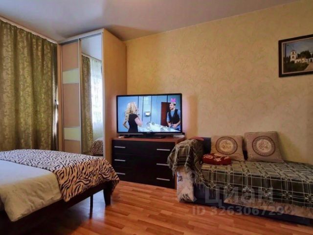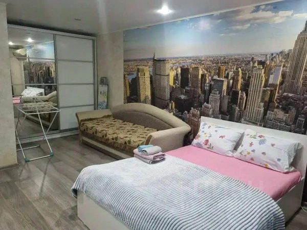 В квартире с комфортом могут разместиться 3 гостя. В большой и светлой комнате находится просторная 2-спальная кровать, диван и раскладное кресло-кровать, раскладушка по запросу предоставляется, телевизор.