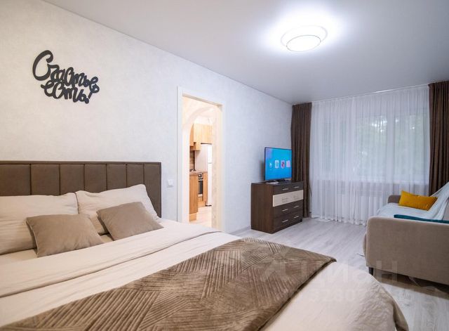 находятся раскладной диван, кресло, торшер, ЖК-телевизор, рабочий стол, сейф, кухонный уголок: чай/кофе станция, электрочайник, раковина, микроволновая печь, двуспальная кровать(1800х2000), прикроватные тумбочки, светил