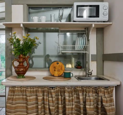 Милый одноэтажный дом, классический "афрейм". Подойдет для отдыха вдвоем или для любителей побыть в одиночестве. В домике компактно собраны все традиционные и нужные для проживания элементы - двуспальная широкая кровать, диван на случай, если будет третий Гость, телевизор, мини-кухня с микроволновкой, индукционной плитой, холодильником. Есть чайник, посуда для приготовления еды и столовая посуда, разделочная доска, нож. В санузле - ванна, раковина, унитаз, фен. В дозаторе над ванной - гель/шампунь в одном хорошего качества