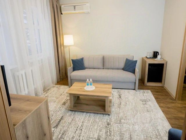 Двухкомнатный номер Люкс, располагается на первом этаже гостевого дома со своей верандой (не балконом) с отдельным выходом в сад к мангальной зоне. В номере: спальня с одной большой двуспальной кроватью king size с ортопедическим матрасом и белым бельём, халаты; шкаф и прикроватные тумбы, трюмо с большим зеркалом, выход на застекленную террасу и внутренний двор, на окнах солнцезащитные шторы. В гостиной раскладной диван и два кресла, стол обеденный и рабочий стол, стулья, ЖК телевизор со спутниковой антенной, электрочайник и набор посуды, чайные наборы. В санузле: душевая кабина, большая раковина с зеркалом с подсветкой, тапочки, полотенца, гигиенические наборы, фен, халаты. На территории для всех гостей есть кухня самообслуживания с обеденной зоной, со всей необходимой посудой, электроплитами, раковиной, большим холодильником, чайник, чай и растворимый кофе. Можно заранее заказать завтраки, 3 вида на выбор, входят в стоимость. Кофе из кофемашины (за доплату). на территории есть детская игровая площадка с горкой, в теплый сезон устанавливается батут. Оборудована комната для игры в настольный теннис. Зона очага с мангалами, с возможностью самостоятельного приготовления шашлыка. Большая ухоженная озелененная территория. На территории есть замечательный банный комплекс: баня на дровах, хаммам, большой и теплый бассейн 4х8 с противотоком, гидромассажем и водопадом (предварительная бронь за доплату). Для всех наших гостей предоставляется возможность посетить бассейн в будние дни с 8:00 до 10:00- бесплатно. Рядом пруд с деревенским пляжем. Можно искупаться, половить удочкой рыбу. Зимой есть возможность покататься с горки на тюбингах. Оплата производится любым удобным гостю способом. Недорогое жильё на сутки в Щекинском районе Тульской области.